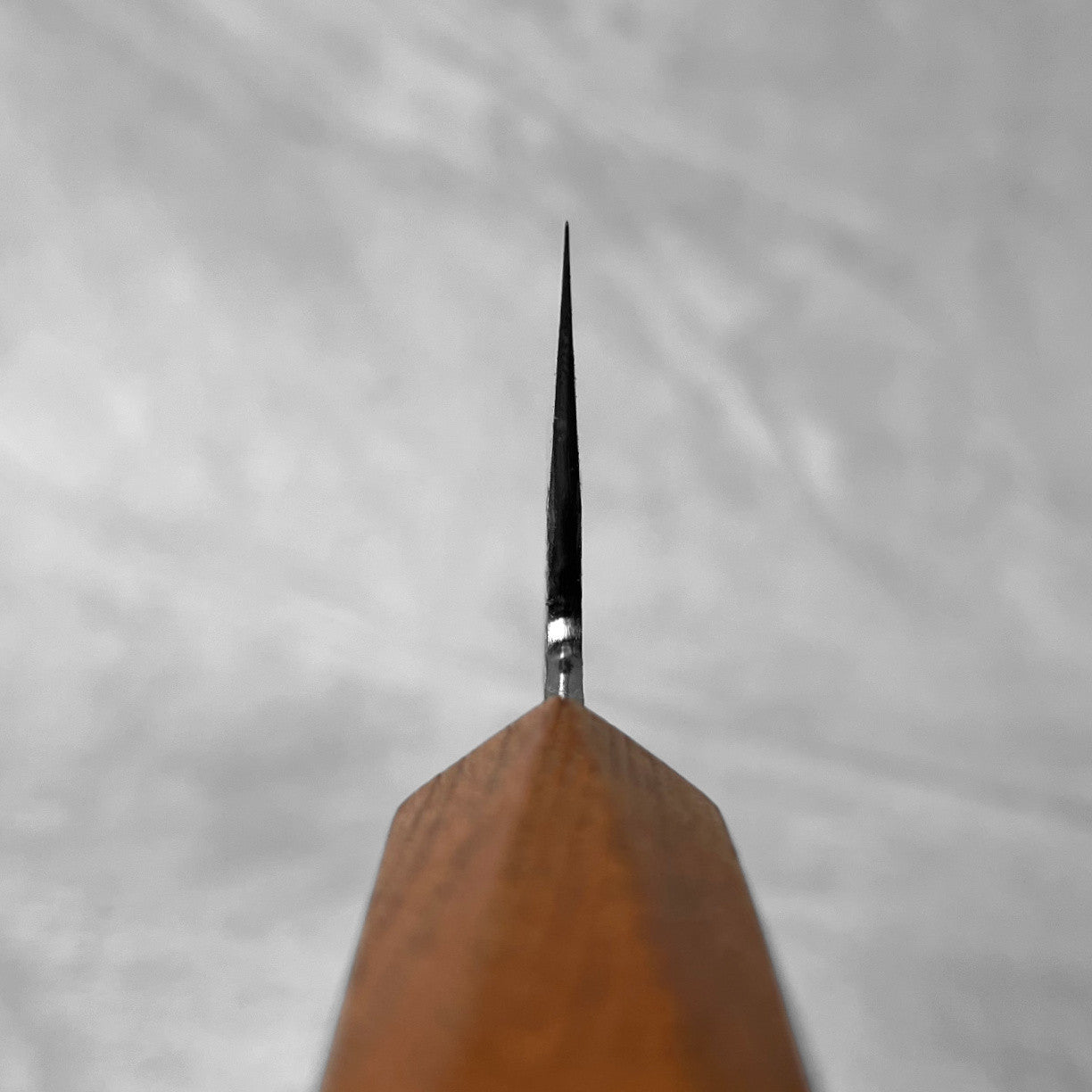 At the heart of the blade is Shirogami #1 (White #1) carbon steel, hardened to around 64 HRC. Known for its extremely fine grained structure, White #1 can achieve exceptional sharpness and offers a crisp, lively cutting feel prized by professional chefs. The core steel is protected by a stainless steel cladding in a san-mai construction, which helps reduce maintenance while still allowing the edge to develop a natural patina over time.