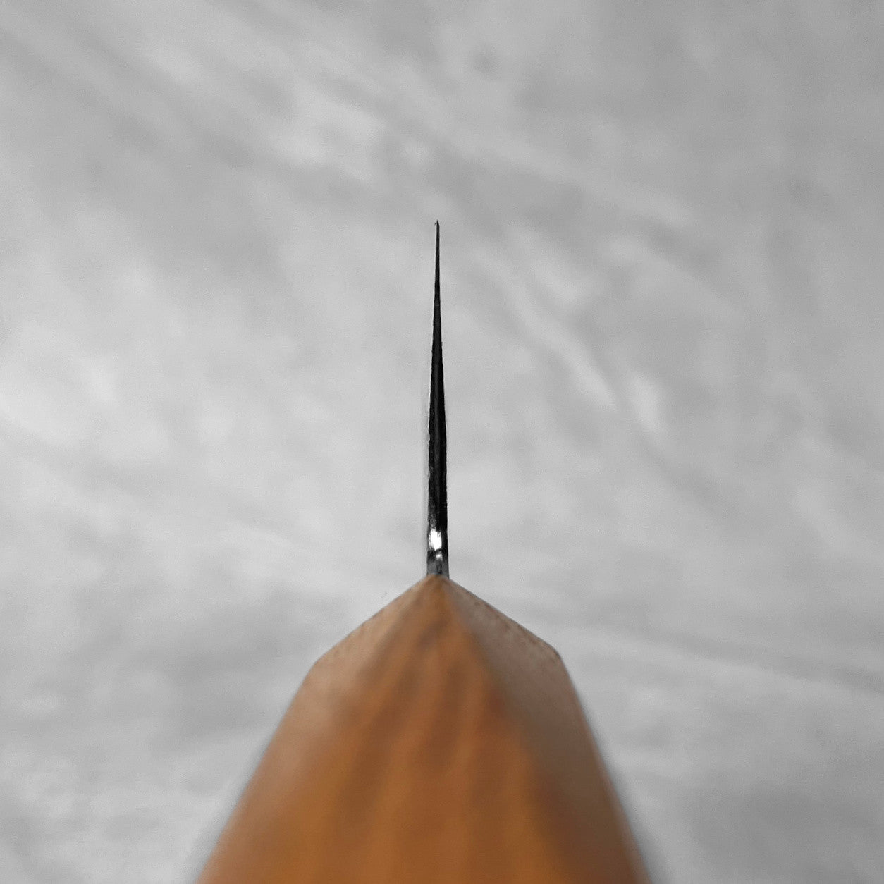 At the heart of the blade is Shirogami #1 (White #1) carbon steel, hardened to around 64 HRC. Known for its extremely fine grained structure, White #1 can achieve exceptional sharpness and offers a crisp, lively cutting feel prized by professional chefs. The core steel is protected by a stainless steel cladding in a san-mai construction, which helps reduce maintenance while still allowing the edge to develop a natural patina over time.