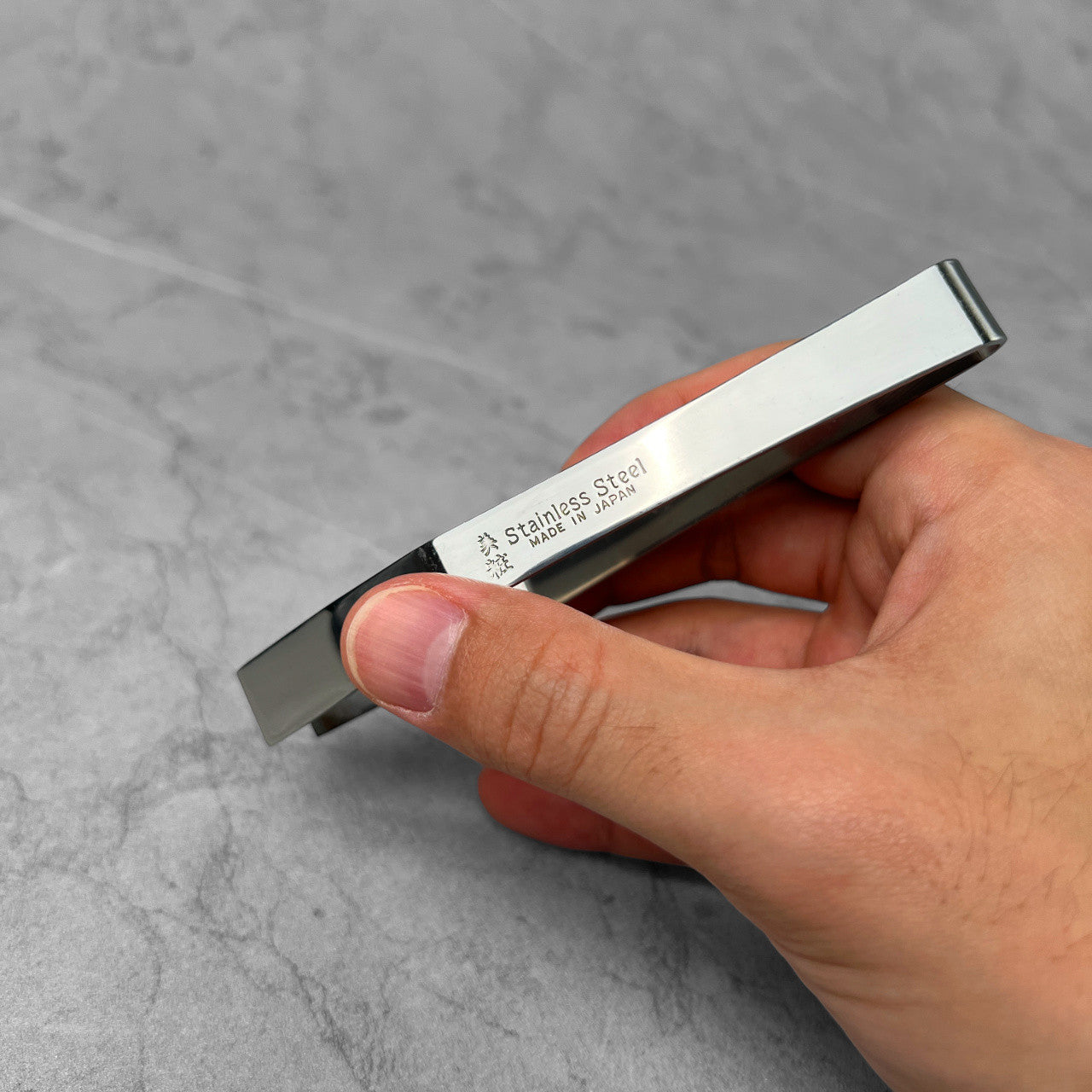 This Nishigata Honenuki (square-tip fish bone tweezer) is sturdy and capable of removing even the thinnest pin bones from the fish. The broad and flat tweezer tip provides a larger surface area which helps to catch the bones, while the distinct bend (a traditional Kansai style design) provides a more comfortable grip.