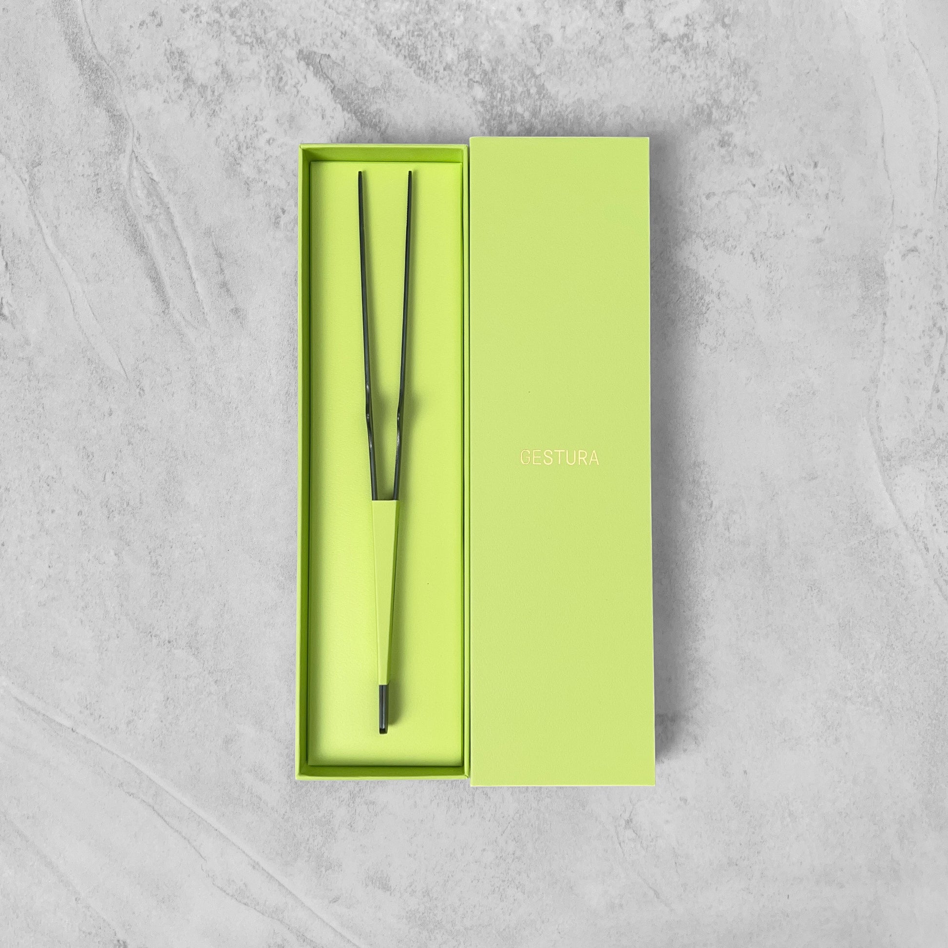 Stando combines the long tapered profile of Japanese cooking chopsticks with the tension and precision of plating tweezers. It is comfortable everywhere from turning small veg in a small pan, to handling noodles and grilling.