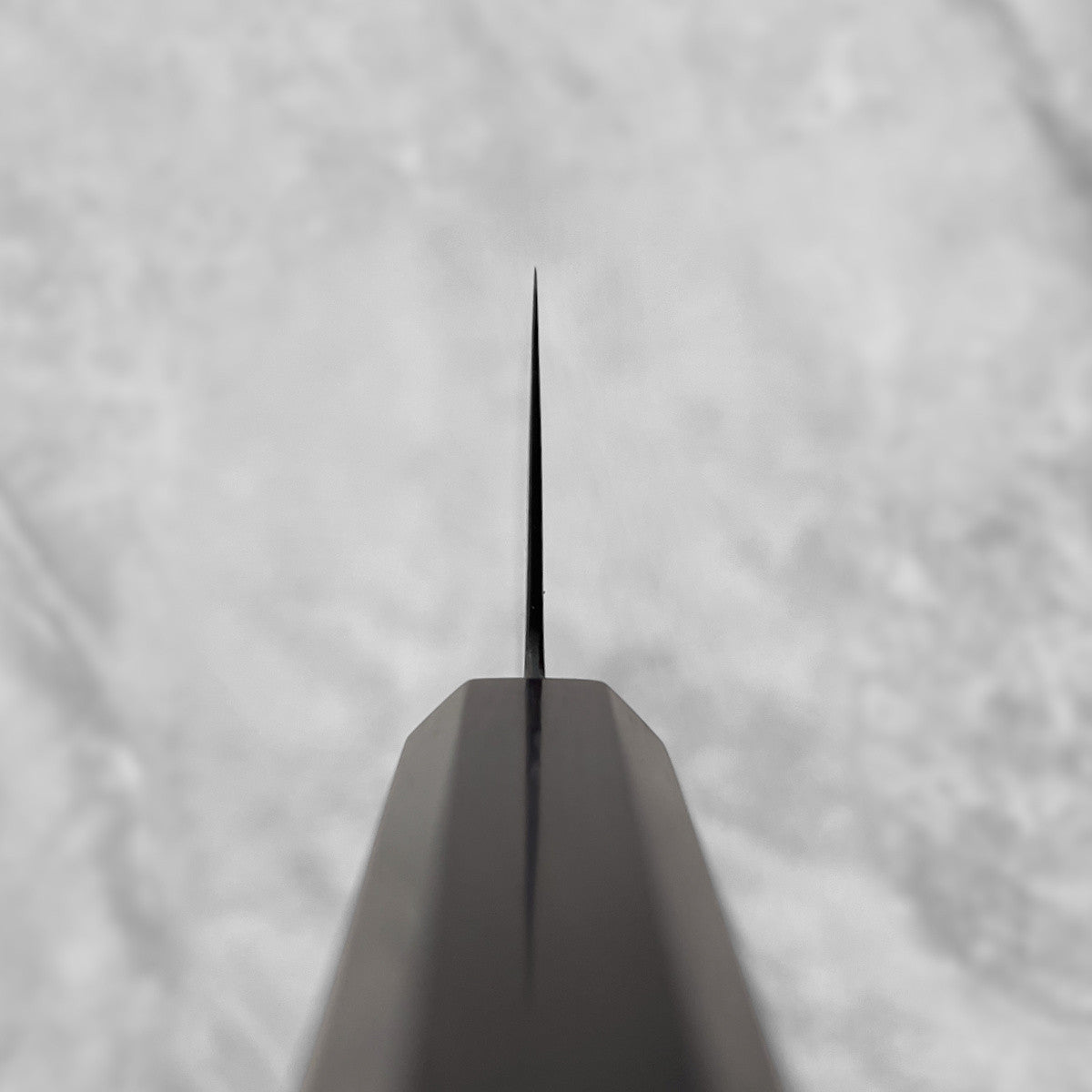 The Ryuhyo Kurozome (流氷, “Flowing Ice”) has a striking damascus finish with a black acid etching. Its thin grind delivers a sharp, smooth, and balanced cutting experience.