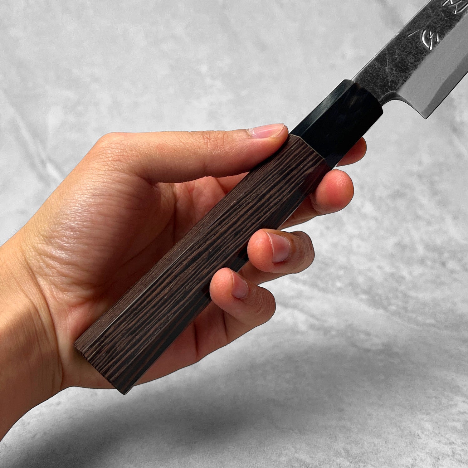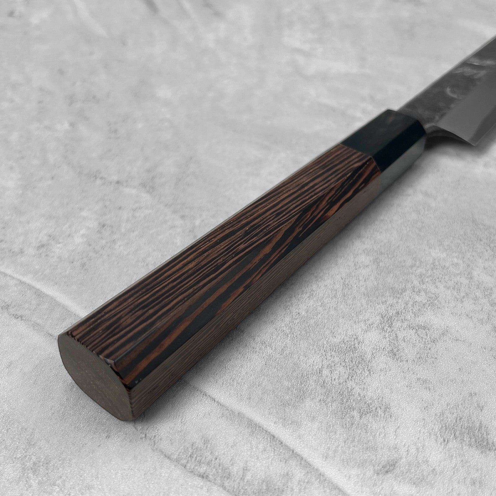 This kiritsuke yanagiba is hand-forged by Toru Tamura and sharpened by Tateo Myojin specifically for the Hatsukokoro brand. Made from Hitachi Aogami #2 (Blue #2) carbon steel and finished in a rustic kurouchi style, the blade offers superb sharpness and excellent edge retention. The 300mm blade length is ideal for professional users who prefer a longer knife for clean, efficient slicing.