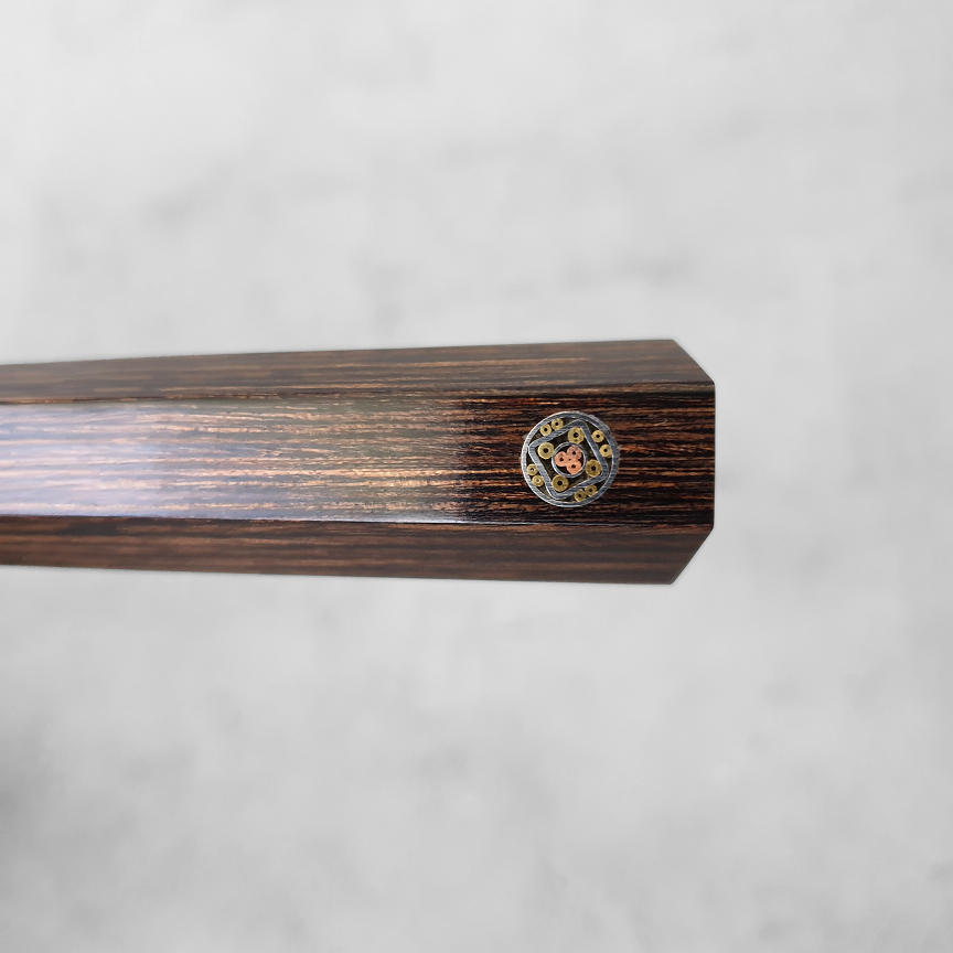 With a beautiful tapering, the knife has an excellent edge geometry. Supported by the harder SG2 steel, the knife maker was able to achieve excellent thinness behind the edge, facilitating great cutting performance. This kitchen knife features a special Shichikaku (Heptagon) handle made of brown pakkawood, with a beautiful mosaic pin for decoration. The "Zuiun" offers one of the best overall fit and finishes at this price range. All knives in this series come in a lovely Paulownia wood box.