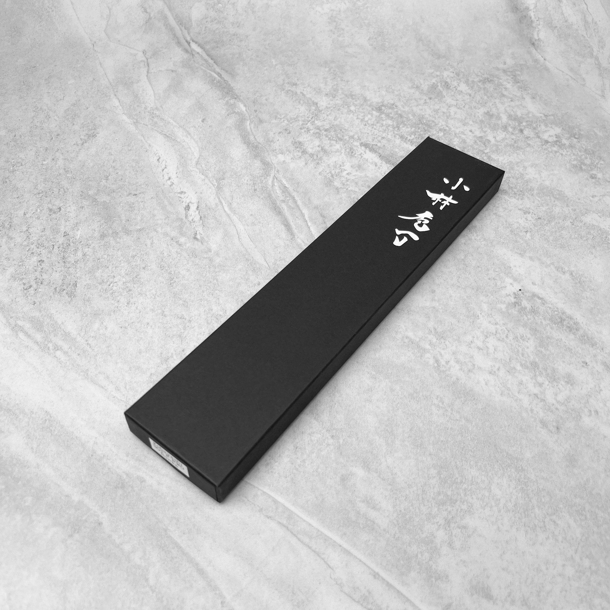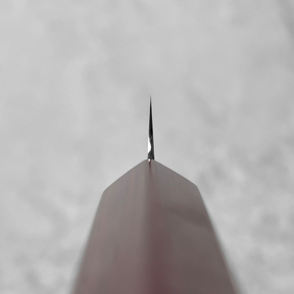 Kei Kobayashi is a somewhat younger knifemaker based in Seki, his knives are known for their incredible thinness and sharpness. Born in 1977, Kobayashi started out as a knife sharpener, sharpening and finishing knives for other brands in Seki. He later founded Kobayashi Hocho with his father, and quickly became known for extraordinary craftsmanship. His knives are true lasers and they certainly make you question: how sharp is too sharp? His attention to detail and sharpening experiences can be seen on this knife, the spine and choil are beautifully polished and make for a comfortable grip.