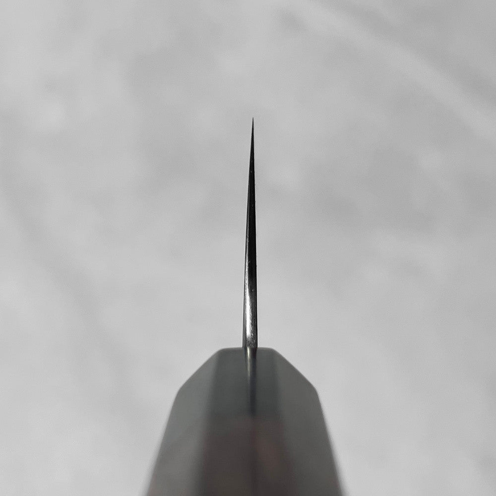 What sets the Koutetsu apart is its exceptional fit and finish. The spine and heel are rounded for comfort, and its brushed finish with engraved kanji delivers understated elegance. A traditional rosewood octagonal handle with pakka wood ferrule keeps the knife lightweight and balanced.