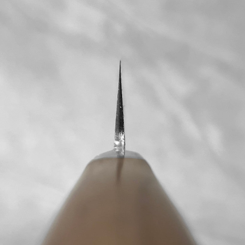 The nashiji (“pear skin”) finish gives the blade a rustic aesthetic, while also helping to reduce food sticking. An integral bolster walnut handle provides a sturdy, comfortable grip, blending both Japanese and western design elements. As a Sanjo forged blade, this collection has the distinct Sanjo taper where the blade is very thick near the handle, then tapers quickly towards the tip. Overall, the Sanjo taper shifts the balance point of the blade towards the bolster and gives the knife a great sense of maneuverability while providing some heft so the blade feels confident in hand.