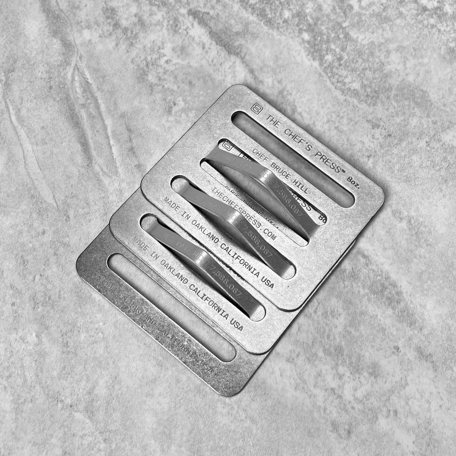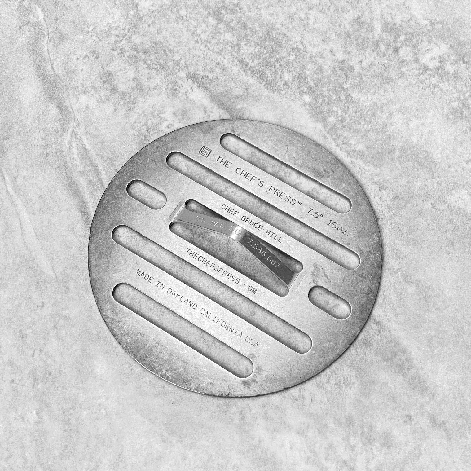 In 2017, Chef Hill began producing The Chef's Press™ Professional line in Oakland California. The new version is made from USA-forged steel and sourced from Mid-American Stainless in Cleveland, OH. The steel is stamped into The Chef's Press™ by Rago & Son in Oakland, using a 100-ton press, just the way Rago has stamped steel since 1945. The custom tooling was designed and built by Precision Metal Tooling, Inc. in Oakland. The presses are then de-burred by DougCo in Oakland. The de-burring removes most of the rough edges caused by the stamping process. Lastly, Chef Hill drives the presses to his workshop in San Francisco, where each press is personally inspected by Chef Hill himself.